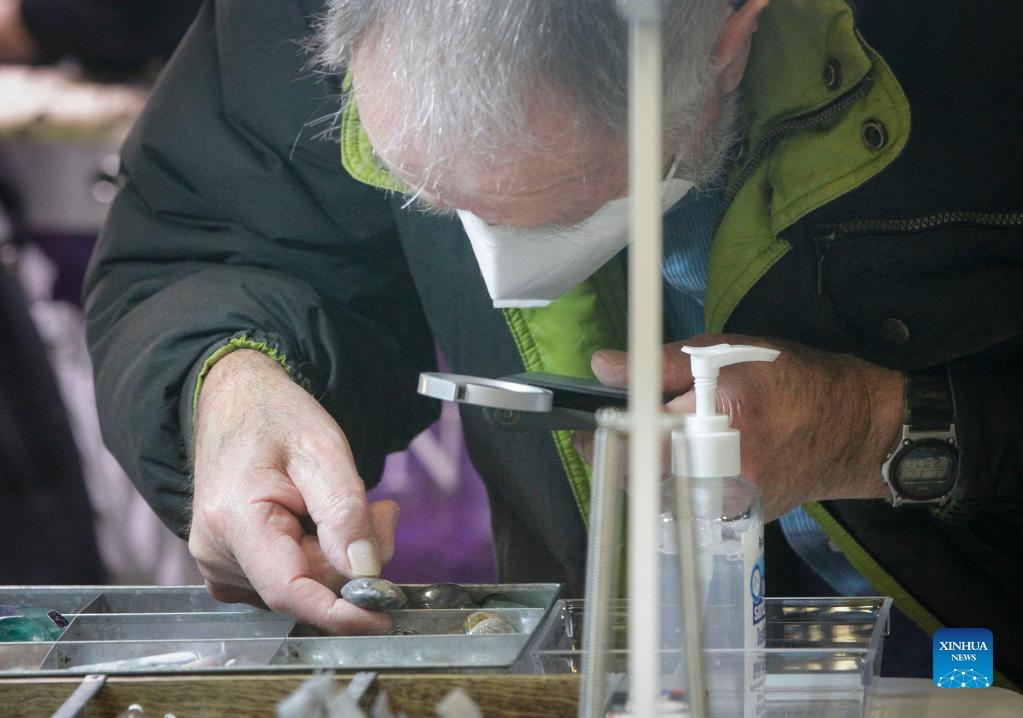 A visitor looks at fossil stones during the Gem and Mineral Show in Vancouver, British Columbia, Canada, on March 25, 2022. The three-day show features about 100 vendors from across Canada with their gem, mineral and rare fossil collections. (Photo by Liang Sen/Xinhua)