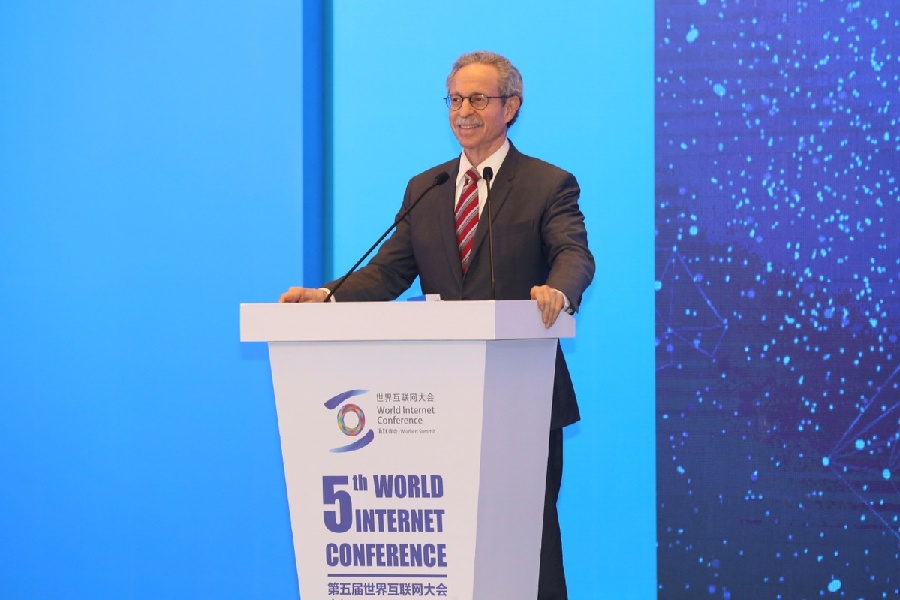 Robert Lawrence Kuhn, chairman of the Kuhn Foundation, hosts the keynote speech I: Digital Divide and Economic Development at a ministerial forum themed "Bridging the Digital Divide" in Wuzhen, East China's Zhejiang province on Nov 8, which serves as a sub-forum of the fifth World Internet Conference. (Photo by Xu Jingxing /chinadaily.com.cn)