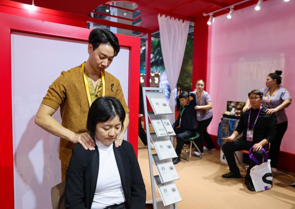 11月5日,人们在第八届进博会国家展泰国馆体验泰式按摩。