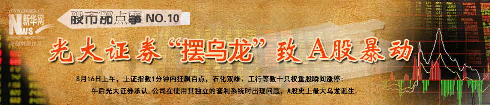 | 繼光大證券“烏龍”事件以來(lái),公司兩項(xiàng)業(yè)務(wù)已被暫停。上海證監(jiān)局要求光大證券策略投資部證券自營(yíng)業(yè)務(wù)從8月19日開始暫停三個(gè)月,中國(guó)銀行間市場(chǎng)交易商協(xié)會(huì)要求暫停光大證券公司非金融企業(yè)債務(wù)融資工具主承銷業(yè)務(wù)。光大證券8月20日復(fù)牌首日一字跌停,在集合競(jìng)價(jià)階段被逾122萬(wàn)手賣單封死在跌停板,報(bào)收10.91元;8月21日跌5.87%,報(bào)收10.27元。復(fù)牌兩日光大證券市值蒸發(fā)達(dá)63.2億元。 |