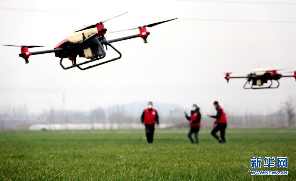 在山東省棗莊市市中區(qū)稅郭鎮(zhèn)野崗埠村,工作人員使用植保無人機在麥田里噴灑除草劑(2021年2月27日攝)。