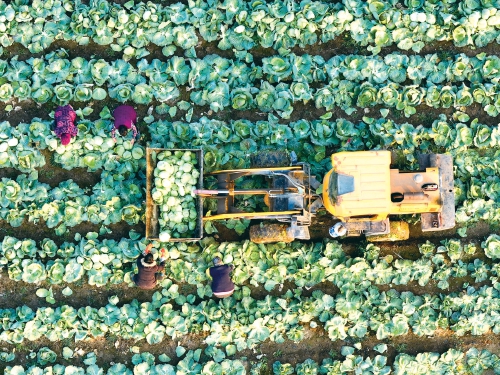 据悉,2025年1月至11月,蒙城县蔬菜播种面积36.55万亩,产量96.61万吨、同比增长4.13%,产品远销南京、上海等国内市场以及新加坡、马来西亚等国际市场,年均供应长三角、粤港澳大湾区绿色蔬菜30万吨。图为在蒙城县岳坊镇皖蔬蔬菜基地,农民正在采收甘蓝,准备供应市场。