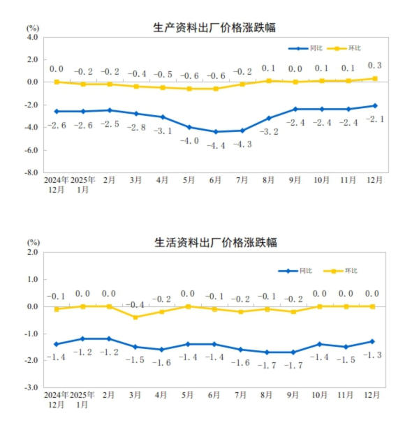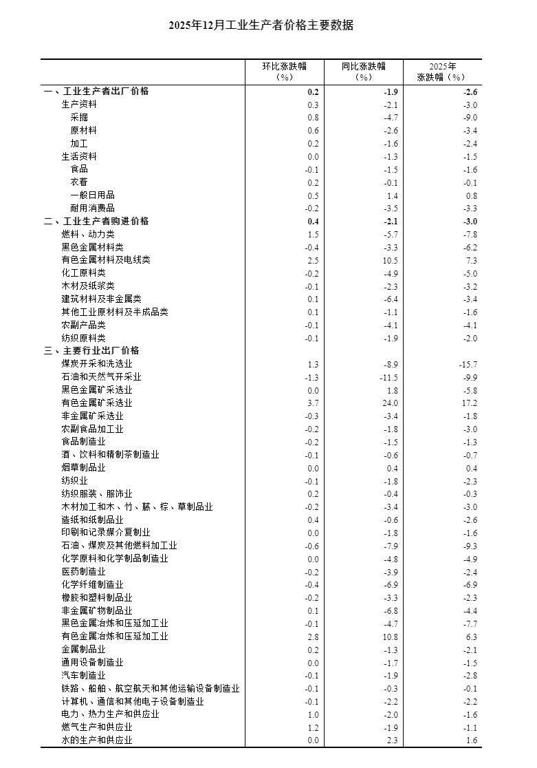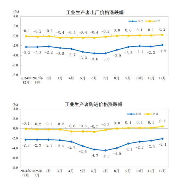 2025年12月份,全国工业生产者出厂价格同比下降1.9%,降幅比上月收窄0.3个百分点;环比上涨0.2%,涨幅比上月扩大0.1个百分点。工业生产者购进价格同比下降2.1%,降幅比上月收窄0.4个百分点;环比上涨0.4%,涨幅比上月扩大0.3个百分点。2025年全年,工业生产者出厂价格下降2.6%,工业生产者购进价格下降3.0%。