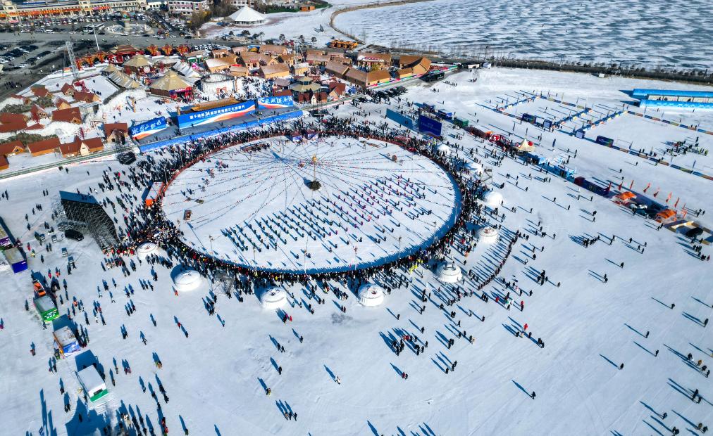 1月8日,在吉林省松原市,人们参加吉林·查干湖第24届冰雪渔猎文化旅游节开幕式(无人机照片)。新华社记者 颜麟蕴 摄