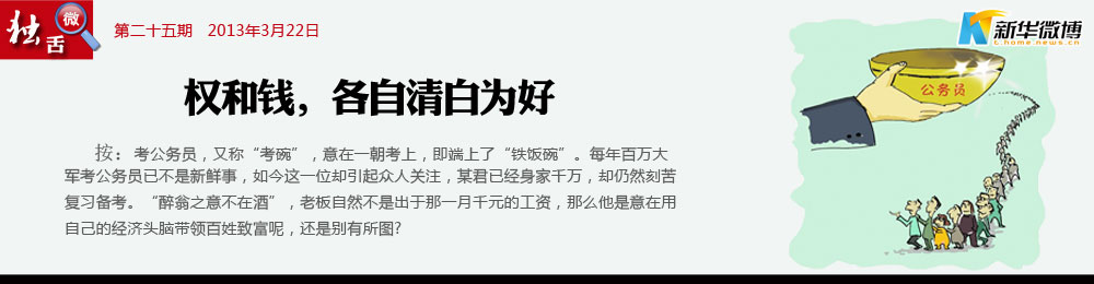 如果千萬富翁考上公務員 千萬富翁考公務員折射的是某些政府部門“門難進、事難辦”的現(xiàn)狀,也反映出當下企業(yè)的生存無奈。假設他有朝中舉,好的結果是政府吸納了一名懂經濟的得力干將,壞的結果則是又多出一個亦官亦商的“紅頂商人”。