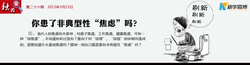 親,你出現(xiàn)“微焦慮”癥狀了嗎? 不“織圍脖”、不接發(fā)微信就寢食難安,出現(xiàn)焦慮、依賴、強(qiáng)迫等心理問(wèn)題。這就是患上了微博焦慮癥,簡(jiǎn)稱為“微焦慮”。