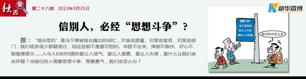 【可怕的“信任危機(jī)”】 賣包子的不吃自己做的包子,種菜的不吃自己種的菜,賣藥的不敢吃自己生產(chǎn)的藥,賣奶粉的則從不吃國產(chǎn)的奶粉……當(dāng)造假作假成為一種風(fēng)氣,甚至成為一種理所當(dāng)然時(shí),每個(gè)人能做的就只剩兩件事了:一個(gè)是只信自己,另一個(gè)是絕不信別人。