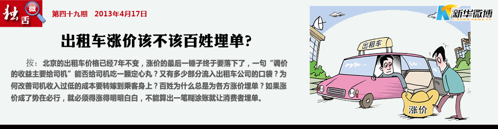 一粬:需考慮全國人民的感受 反對出粗車漲價(jià),北京出租車漲價(jià)的理由居然是根據(jù)北京居民和工薪階層工資上漲幅度為理由,確實(shí)是特權(quán)利益階層短視經(jīng)不起推敲的謬見,北京是全體國家公民一生中最少去一次的城市,所有窗口行業(yè)的收費(fèi)確實(shí)不只是一個(gè)城市的小事情,須思考全國人民的感受。