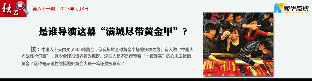 【大媽!威武!】 黃金大戰(zhàn)中,“中國大媽完勝華爾街”,被國人津津樂道。這股史無前例強(qiáng)勁的樂觀、自豪情緒,仿佛是中國百姓扛住了金融危機(jī),人民幣搞定了美元……