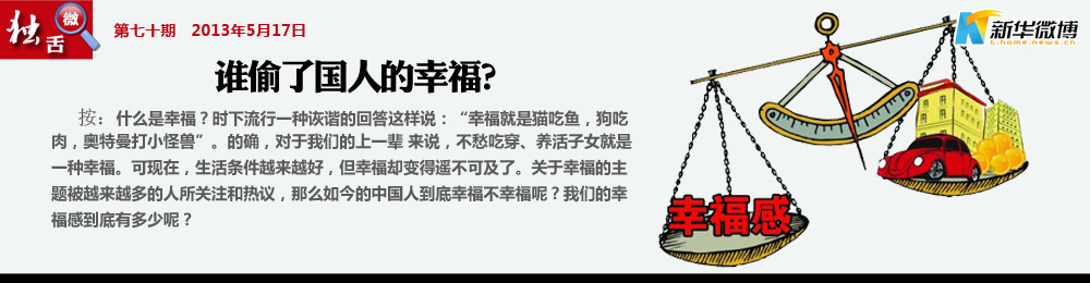 幸福是“比較出來的” 在電影《求求你,表揚我》中,記者王志文問:什么是幸福?農(nóng)民工范偉回答:幸福就是我餓了,看見別人拿了個肉包子,那他就比我幸福;我冷了,看見別人穿了一件厚棉襖,那他就比我幸福;我上茅房,只有一個坑,你蹲了,你就比我幸福。