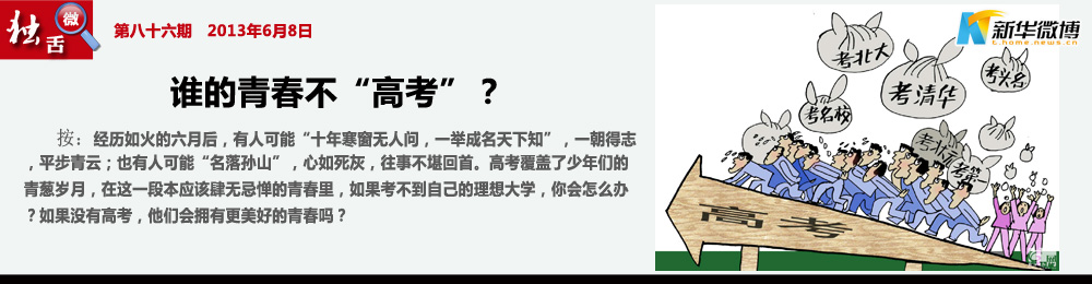 【為經(jīng)濟做貢獻(xiàn)】 算算高考,用了12年青春,至少四五十萬的學(xué)費,我們養(yǎng)活了晨光廠、真彩廠、機讀卡廠、無數(shù)造紙廠、無數(shù)印刷場,翰林書店、新華書店,城市的交通行業(yè),學(xué)校周邊的飯館,以及所有老師的工資獎金、校長的車、油錢……高考是國家支柱型民營企業(yè)!這就是我們的功勞!