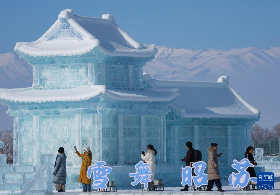 1月3日,游客在新疆昭苏县冰雪乐园参观冰雕作品。
