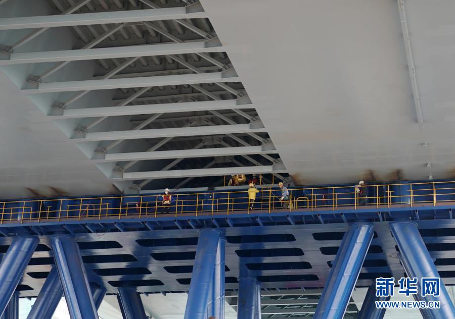 記者搭擺渡小艇登上了載有雙拱鋼橋的半潛駁船。140米長、70米寬的大甲板已經(jīng)夠震撼,抬眼望去,由船上若干根二十多米高的藍(lán)色柱子托舉起的雙拱鋼橋,儼然是一個海上“巨無霸”。