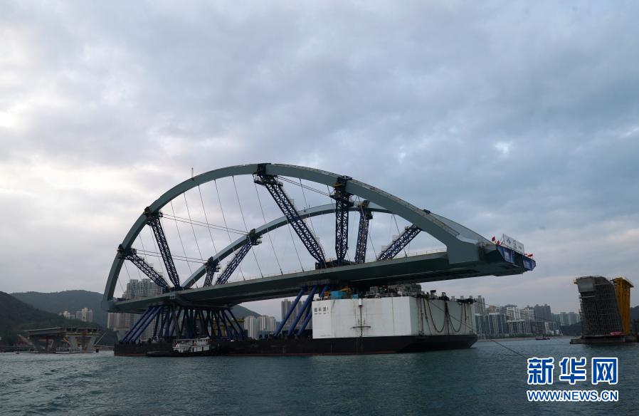 2月26日,將軍澳跨灣大橋主橋順利完成浮托安裝,浮托安裝總重達(dá)12000噸,總長214米,創(chuàng)造國內(nèi)單體拱橋整體安裝的新紀(jì)錄。