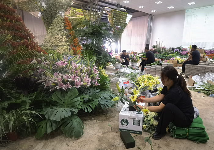搭建會(huì)場(chǎng)獻(xiàn)花藝(李雪芹 攝)