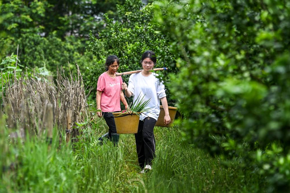 刘燕家的菜地面积不大,蔬菜整整齐齐排列,刚浇过水的菜叶上挂着水珠。给菜地浇完水,她和母亲便准备回家。两人收拾好农具,刘燕自然地挑起扁担。一路上,刘燕的脊背挺直,步子稳健,母亲跟在她身后,脚步不快,两人沿着田埂前行……
