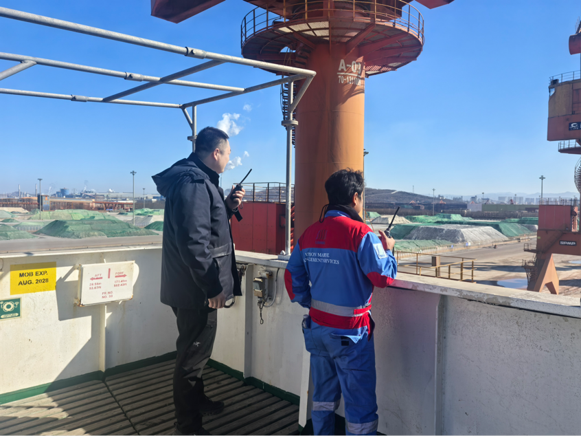 2026年2月22日,引航员王子建(左)引领船舶出港。新华网 于珊 摄