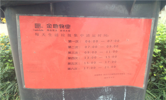 物業(yè)服務方面業(yè)主總體表示很滿意,其中一位陳姓業(yè)主告訴記者:“小區(qū)內(nèi)定期會有專人進行綠化養(yǎng)護和衛(wèi)生保潔,環(huán)境非常好?!蓖瑫r,記者還發(fā)現(xiàn)基本上小區(qū)內(nèi)垃圾桶上都貼有明確的每日清運時間,非常人性化。