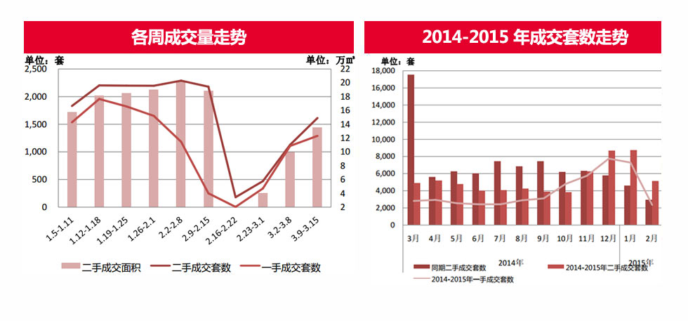 受兩會(huì)期間房地產(chǎn)利好風(fēng)向標(biāo)的影響,三月成交 持續(xù)升溫,本周(3.9-3.15)成交套數(shù)環(huán)比上漲16.53%,成交面積環(huán)比上漲15.03%;成交均價(jià)跌6.88%。