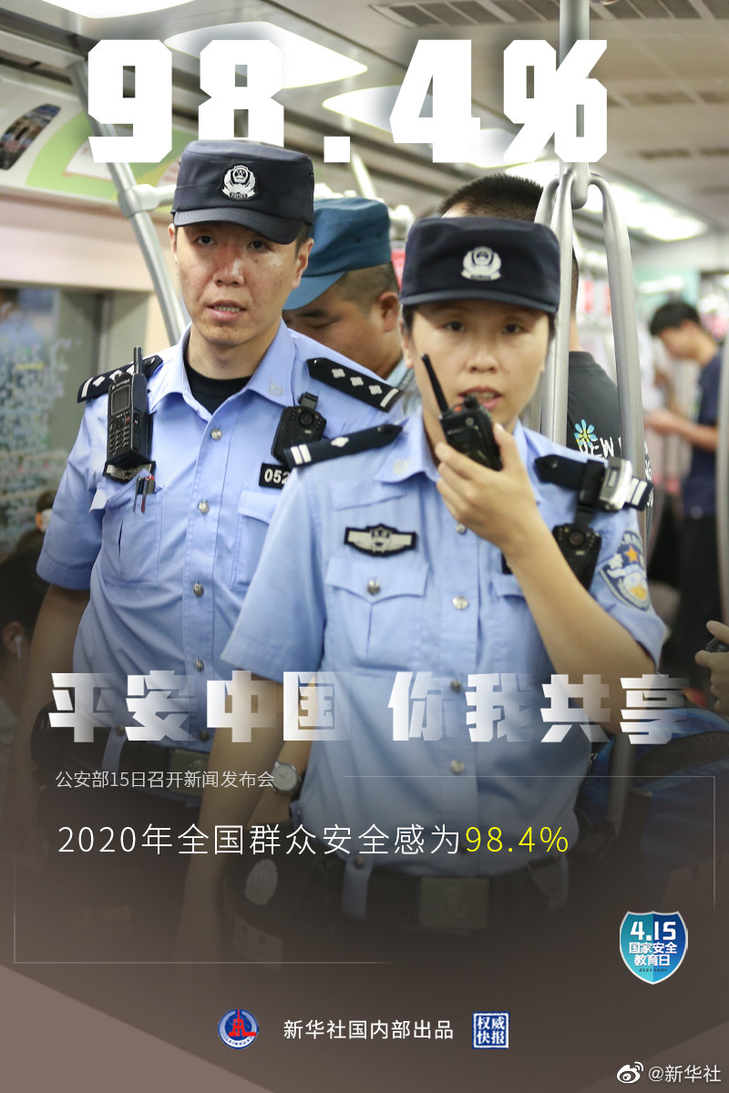 4月15日是第六個全民國家安全教育日,公安部15日召開新聞發(fā)布會介紹:2020年全國群眾安全感為98.4%,全國居民對社會治安滿意度達83.6%。截至2020年,全國刑事案件立案總量連續(xù)5年下降,八類主要刑事案件數(shù)和查處治安案件數(shù)連續(xù)6年下降。(記者熊豐,海報設(shè)計張晨光)