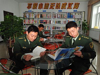 官兵在警營(yíng)圖書室看書