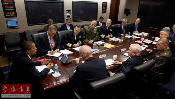 ??? 資料圖:2009年10月,美國總統(tǒng)奧巴馬在白宮時(shí)局值班室與美軍參謀長(zhǎng)聯(lián)席會(huì)議成員及高級(jí)軍事顧問商討阿富汗作戰(zhàn)事宜。