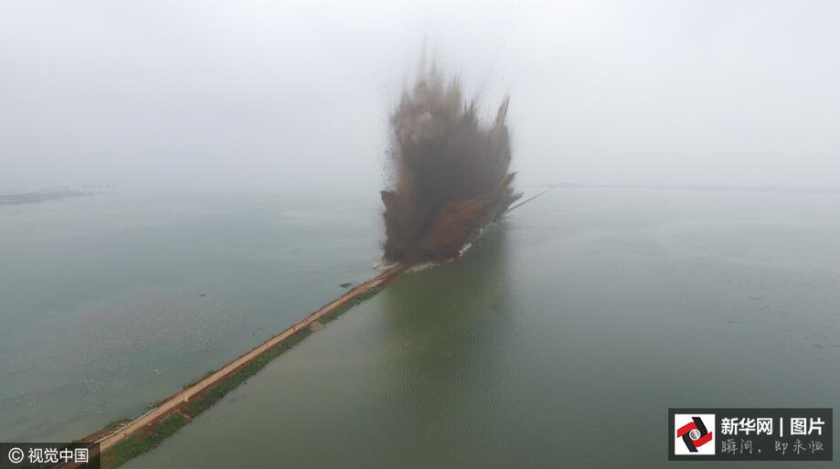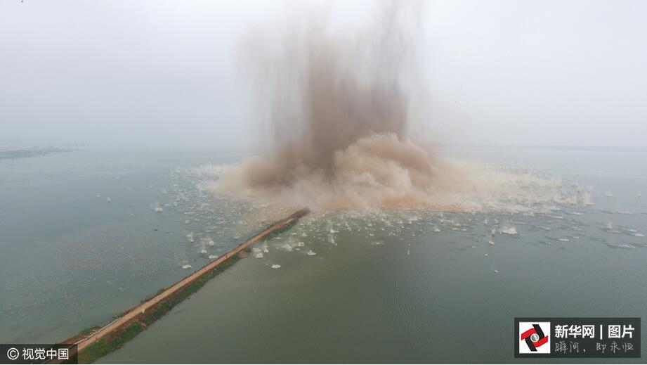 ??? 7月14日7時(shí),伴隨著一聲聲的爆破轟鳴,梁子湖與牛山湖隔堤正式實(shí)施爆破作業(yè),這標(biāo)志著湖北梁子湖流域的牛山湖正式破垸分洪。(圖片來(lái)源:視覺中國(guó))