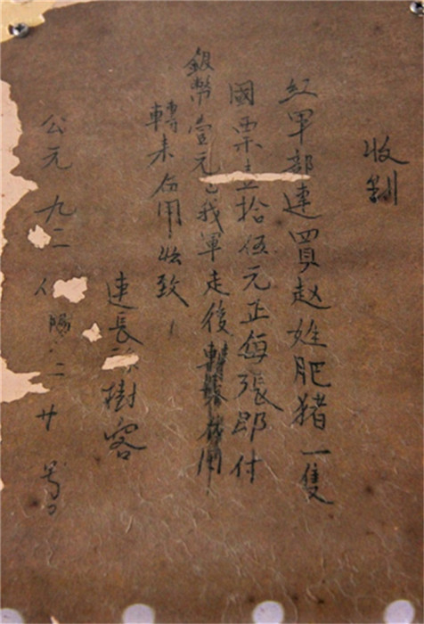 紅軍給群眾寫的買豬收條(資料照片)
