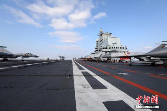 資料圖:2016年12月23日,在黃海某海空域,多批次殲-15艦載戰(zhàn)斗機(jī)從遼寧艦飛行甲板起飛升空,開(kāi)展了空中加受油、空中對(duì)抗等多項(xiàng)訓(xùn)練任務(wù)。 中新社發(fā) 莫小亮 攝