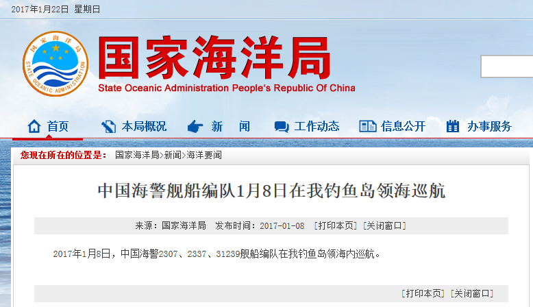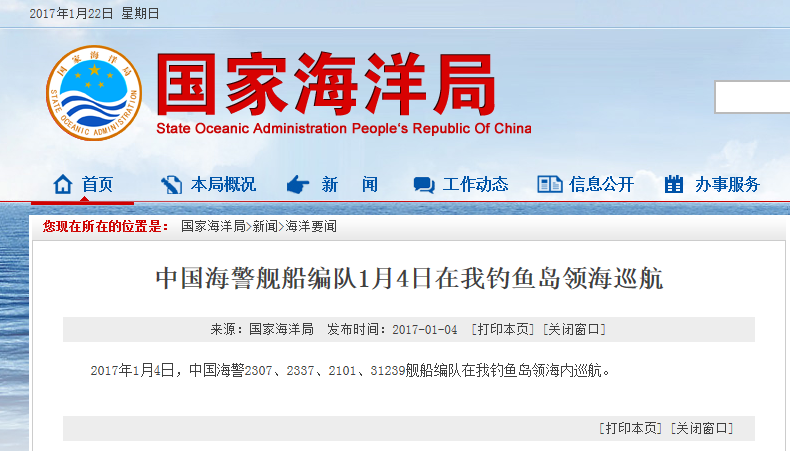 新華網(wǎng)北京1月22日電 據(jù)國家海洋局網(wǎng)站報道,2017年1月22日,中國海警2501、2308、2302艦船編隊在我釣魚島領(lǐng)海內(nèi)巡航。