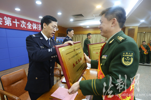圖為胡焯副主席為優(yōu)秀官兵代表頒獎 梁鈞銘攝