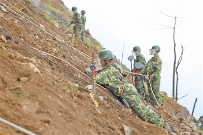 30余名官兵身著數(shù)十斤重的迷彩防護(hù)服,腰系白色安全繩,右手持探雷器,左手抓繩,像城市高樓間的“蜘蛛人”一般,在近乎垂直的山坡上進(jìn)行人工搜排作業(yè)。隨著金屬探雷器報(bào)警聲不斷,官兵們反復(fù)掃描確認(rèn),再抽出探雷針,向土里輕輕捅扎,確認(rèn)地雷位置、大小、類型,插上小紅旗標(biāo)識(shí)……