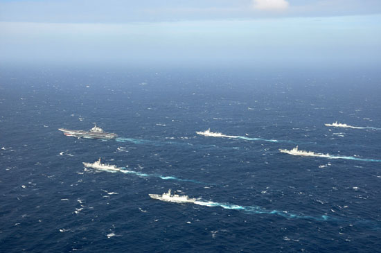 2016年12月26日,執(zhí)行跨海區(qū)訓(xùn)練任務(wù)的中國(guó)海軍遼寧艦航母編隊(duì)。視覺(jué)中國(guó)供圖(資料圖片)