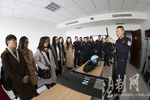 ????上午9時,一輛掛著“相約藍(lán)盔、愛在警營”紅色橫幅的大巴車緩緩駛?cè)刖牋I區(qū)。一下車,姑娘們饒有興致地參觀了警隊內(nèi)務(wù)設(shè)置和裝備展示,現(xiàn)場觀看了藍(lán)盔方陣扣人心弦的戰(zhàn)術(shù)表演,隊員們氣吞萬里的練兵激情、敢打必勝的過硬素質(zhì),一下子吸引了大家的眼光。在此之前,她們只是在心中默默仰慕那頂“藍(lán)色貝雷帽”,從電視上看到過威武帥氣的維和隊員。第一次如此近距離接觸,讓不少姑娘的心中蕩起層層漣漪。