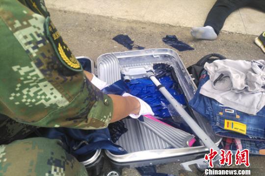 執(zhí)勤官兵在密碼箱夾層中發(fā)現(xiàn)了毒品可疑物。周少飛 攝