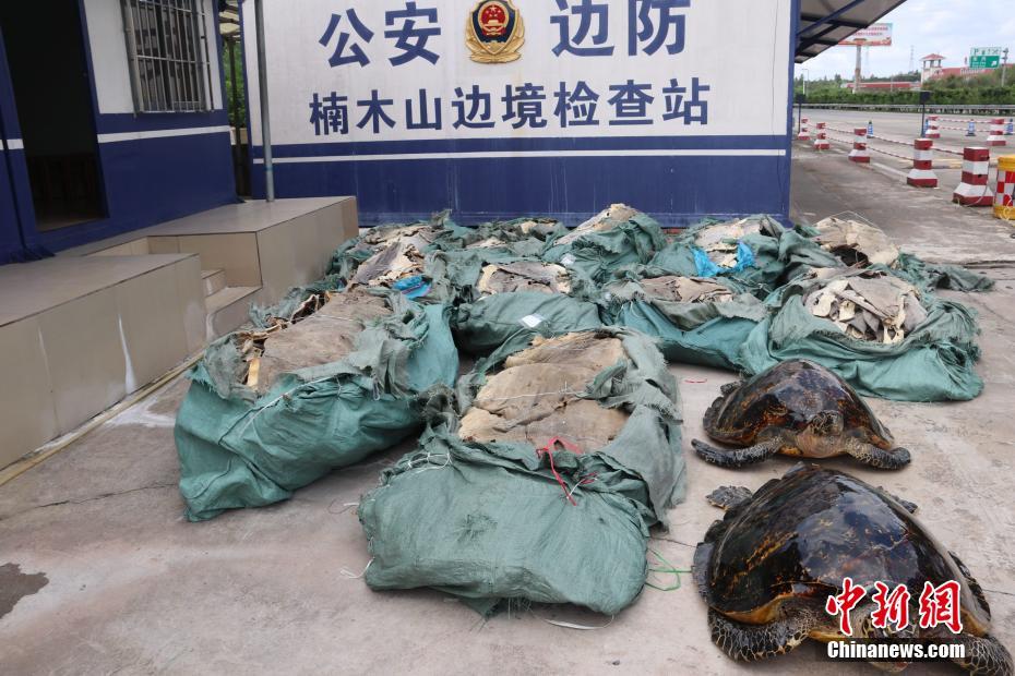 ????6月27日,廣西防城港邊防支隊(duì)楠木山邊境檢查站執(zhí)勤官兵在對(duì)一輛重型廂式貨車(chē)?yán)袡z查時(shí),查獲涉嫌非法運(yùn)輸玳瑁標(biāo)本2只、鯊魚(yú)皮11袋。這兩只玳瑁標(biāo)本重量共達(dá)到40多公斤,而11袋鯊魚(yú)皮重約1噸。據(jù)悉,玳瑁是國(guó)家二級(jí)重點(diǎn)保護(hù)野生動(dòng)物,已被列入《世界自然保護(hù)聯(lián)盟》(IUCN)2012年瀕危物種紅色名錄。(張振國(guó))