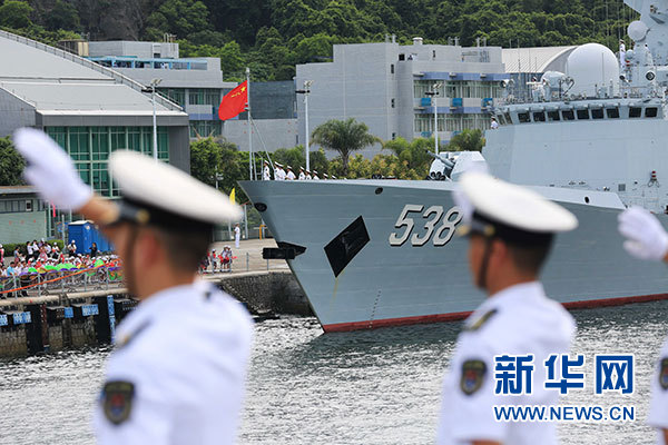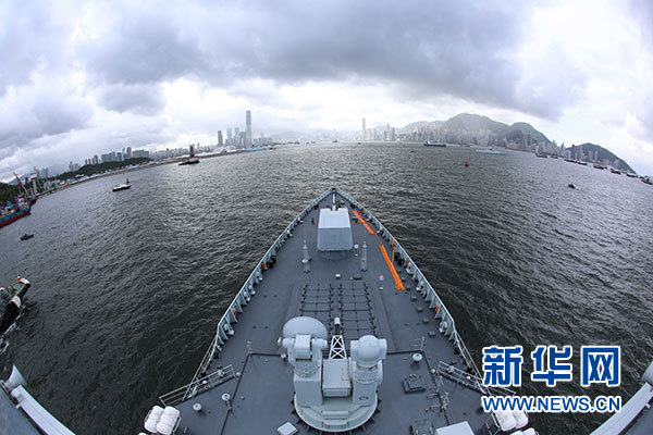 7月7日,海軍銀川艦駛?cè)胂愀郯捍薮a頭。當(dāng)日,正在執(zhí)行跨區(qū)機(jī)動(dòng)訓(xùn)練任務(wù)的中國人民解放軍海軍航母編隊(duì)抵達(dá)香港,參加香港回歸祖國暨中國人民解放軍進(jìn)駐香港20周年慶?;顒?dòng),受到香港特區(qū)政府和民眾熱烈歡迎。新華社記者 曾濤 攝