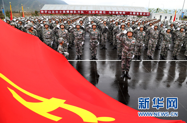 2015年勝利日大閱兵訓(xùn)練期間,“狼牙山五壯士”英模部隊(duì)方隊(duì)組織宣誓活動(2015年6月29日攝)。新華社發(fā)