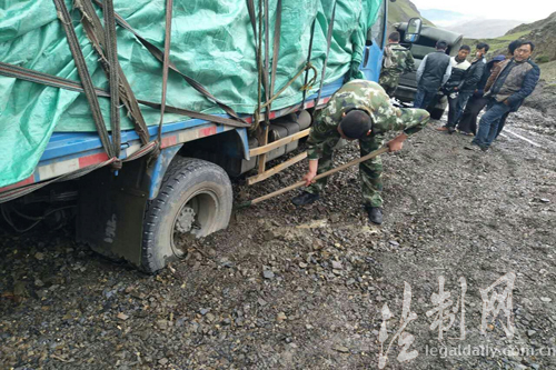 ????連日來(lái),受強(qiáng)降雨天氣影響,通往西藏山南市錯(cuò)那縣卡達(dá)鄉(xiāng)道路因山體塌方和泥石流損毀嚴(yán)重,7月23日中午12時(shí),西藏邊防總隊(duì)山南邊防支隊(duì)卡達(dá)邊防派出所接轄區(qū)居民電話(huà)報(bào)警稱(chēng):商店運(yùn)貨貨車(chē)在返回卡達(dá)鄉(xiāng)途中陷入泥潭,請(qǐng)求派出所救援。接到消息后,該所迅速組織官兵趕往現(xiàn)場(chǎng),并持續(xù)關(guān)注道路情況和受困狀況。到達(dá)現(xiàn)場(chǎng)后,邊防官兵立即展開(kāi)救援,用十字鎬挖、用手刨、用人推,經(jīng)過(guò)2個(gè)小時(shí)的不懈努力,最終成功把陷入泥坑的貨車(chē)?yán)觥>仍Y(jié)束后,邊防官兵就近取材把泥坑填平,并設(shè)立警示標(biāo)志,確保后續(xù)車(chē)輛順利通過(guò)。現(xiàn)場(chǎng)無(wú)人員受傷,車(chē)輛完好。