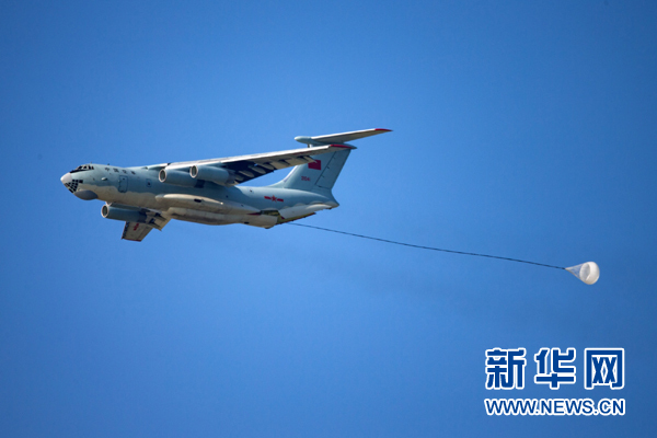 8月4日,中國(guó)空軍伊爾-76戰(zhàn)機(jī)在“航空飛鏢”靶場(chǎng)開(kāi)放日進(jìn)行重裝空投。新華社發(fā)(楊盼 攝)