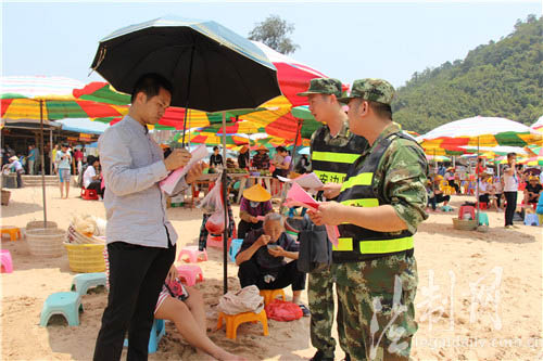 ????在天氣越來越熱的夏季,“海邊游”受到越來越多游客的追捧和青睞。尤其正值暑期,許多游客選擇帶小孩到海邊避暑。為使游客玩得舒心和盡興,廣西公安邊防總隊(duì)防城港邊防支隊(duì)江山邊防派出所針對(duì)夏季旅游景點(diǎn)溺水、小孩走失等易發(fā)多發(fā)的實(shí)際,組織官兵深入轄區(qū)景點(diǎn)開展安全宣傳活動(dòng)。