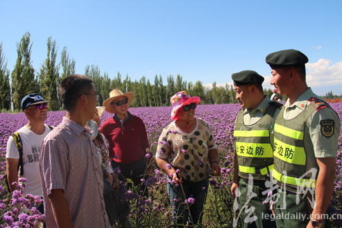 ????每年6月、7月,數(shù)萬畝薰衣草爭相怒放,匯成一片紫色的海洋,吸引大量游客前去觀賞。新疆公安邊防總隊伊犁邊防支隊梁三宮邊防派出所官兵因地制宜打造“紫郁之鄉(xiāng)110”這一特色警務(wù),在治安防控、服務(wù)群眾、素質(zhì)提升等方面走出了一條新路子,用使命、責(zé)任與情感為游客保駕護(hù)航,讓游客享受一趟“滿意之旅”。