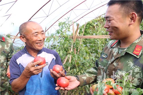 圖為當(dāng)?shù)剞r(nóng)民稱贊官兵自己種植的西紅柿