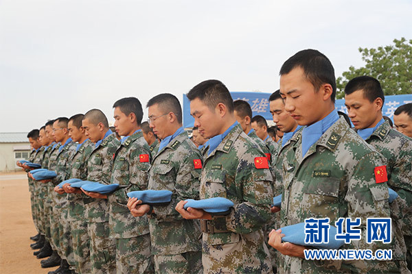 祭奠儀式上,大型機(jī)械鳴笛三聲,哀思樂曲響起,全體官兵整裝列隊(duì),集體脫帽為犧牲在維和戰(zhàn)場(chǎng)上的英烈默哀三分鐘。隨后,官兵代表致辭,追憶維和英烈們無私奉獻(xiàn)、舍生取義的光輝事跡,表達(dá)為達(dá)爾富爾地區(qū)和平建設(shè)而努力奮斗的堅(jiān)定決心。
