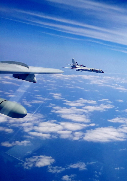??? 4月19日,中國(guó)空軍轟-6K等多型戰(zhàn)機(jī)執(zhí)行“繞島巡航”任務(wù)。中國(guó)空軍4月21日向海內(nèi)外發(fā)布多語(yǔ)種宣傳片《戰(zhàn)神繞島新航跡》??哲姂?zhàn)神轟-6K等戰(zhàn)機(jī)近日連續(xù)3天“繞島巡航”的震撼畫(huà)面,在宣傳片中集中展現(xiàn),彰顯了空軍飛行員維護(hù)國(guó)家主權(quán)和領(lǐng)土完整的意志能力。新華社發(fā)(翟培松 攝)