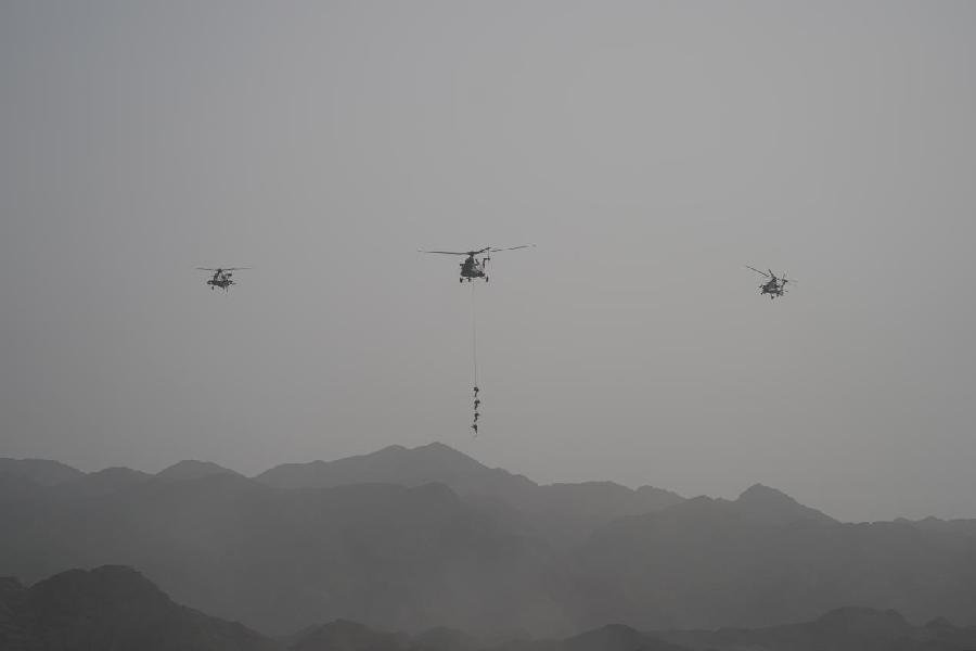 ????23日,陸軍新質(zhì)作戰(zhàn)力量演練在陸軍多個演兵場連續(xù)“打響”,8支新質(zhì)作戰(zhàn)力量輪番上陣。圖為特戰(zhàn)隊員在武裝直升機護(hù)衛(wèi)下進(jìn)行直升機懸吊撤離。新華社記者王東明 攝