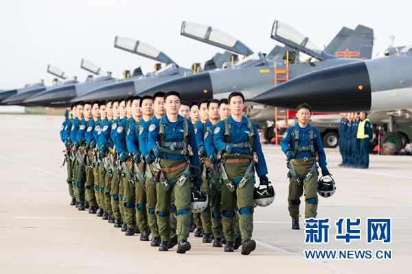 空軍“先鋒飛行大隊(duì)”飛行員列隊(duì)走向戰(zhàn)機(jī)(9月14日攝)。 新華社發(fā)(楊盼 攝)