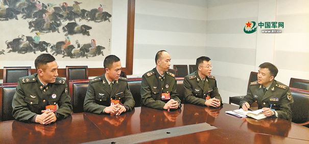 ????解放軍報(bào)記者孫興維(右一)采訪軍隊(duì)人大代表?xiàng)畛醺裎?、楊磊、齊虎廣、謝正誼(左一至左四)。尹繼冬 攝