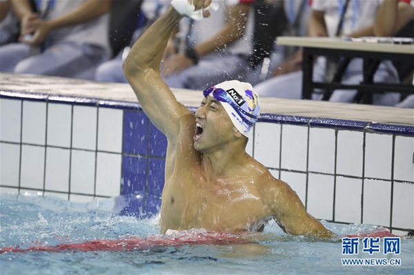 當(dāng)張政到達(dá)終點(diǎn)的那一刻,岸上響起了掌聲和叫好聲。此時(shí),大屏幕上一直閃動(dòng)著張政的成績(jī):“00:23.8”,泳池中的張政興奮地大喊了幾聲,有觀眾也跟著呼喊了起來(lái)。