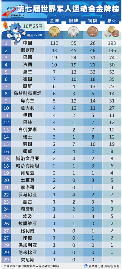 新華社武漢10月25日電(記者王恒志 梁建強(qiáng))112金!中國軍團(tuán)25日在武漢舉行的第七屆軍運(yùn)會(huì)上實(shí)現(xiàn)了金牌破百、獎(jiǎng)牌近兩百的優(yōu)異戰(zhàn)績。當(dāng)日中國軍團(tuán)在田徑、跳水、體操、射擊、海軍五項(xiàng)、拳擊等多個(gè)項(xiàng)目上迎來爆發(fā),單日收獲24金。
